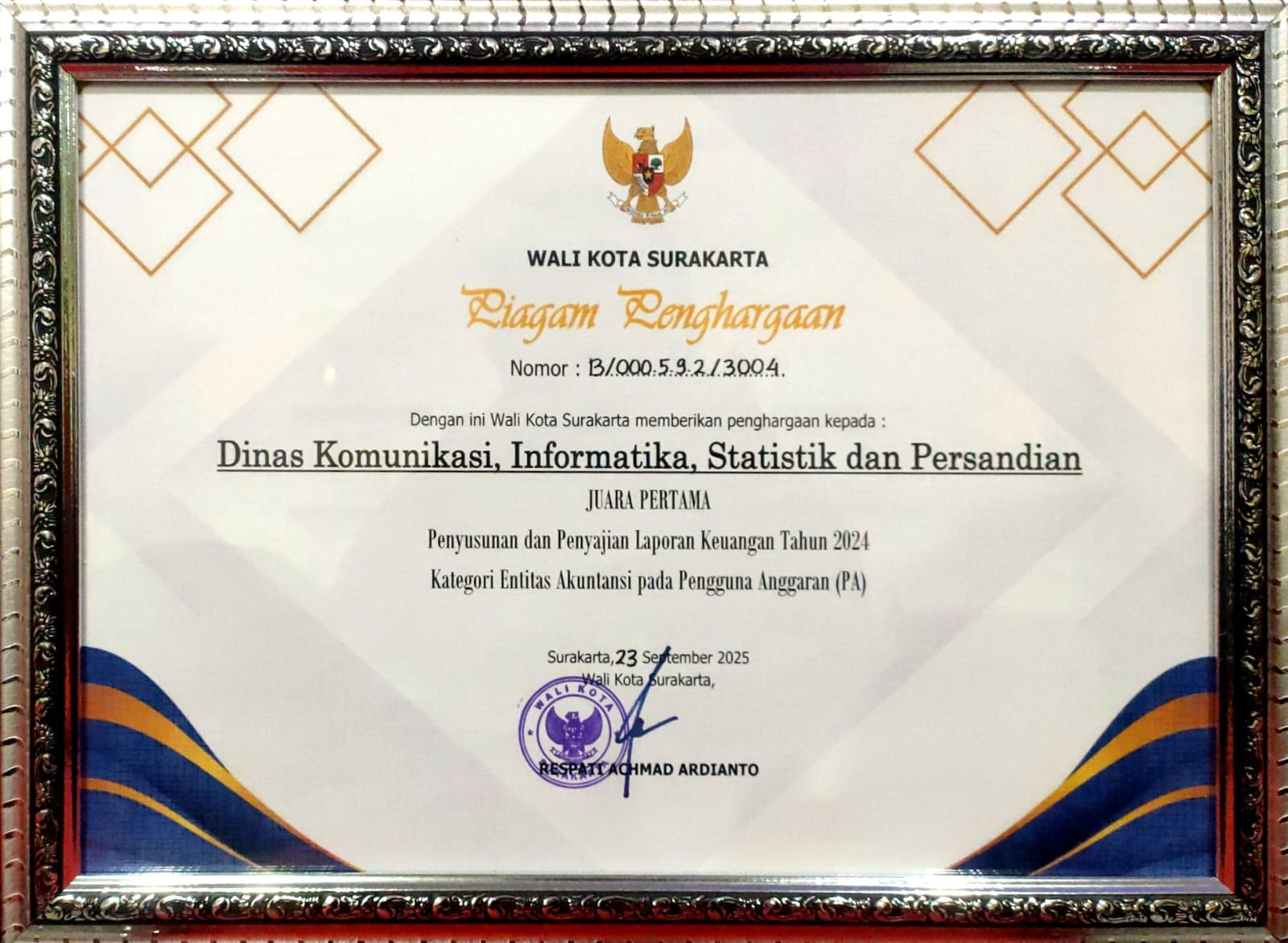 Juara Pertama Penyusunan dan Penyajian Laporan Keuangan Tahun 2024 kategori Entitas Akuntansi pada Pengguna Anggaran (PA)
